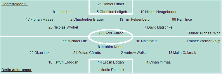 Lichterfelder FC: Daniel Bittner - Julian Loder, Christian Leitgeb, Niklas Neugebauer - Florian Haase, Christopher Bräuer (69. Milos Marinkovic), Tim Felsenberg, Halil Ince - Nicolas Wrobel, David Matschke (30. Marco-Andreas Wolff) - Lukoki Kalixto