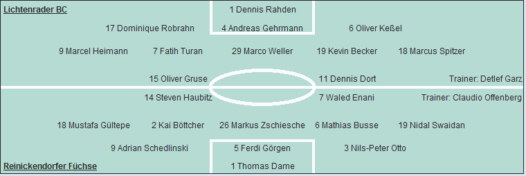 Lichtenrader BC: Dennis Rahden - Dominique Robrahn, Andreas Gehrmann, Oliver Keßel - Marcel Heimann, Fatih Turan (55. Mario Diederitz), Marco Weller, Kevin Becker, Marcus Spitzer - Oliver Gruse (55. Yannick Woithe), Dennis Dort