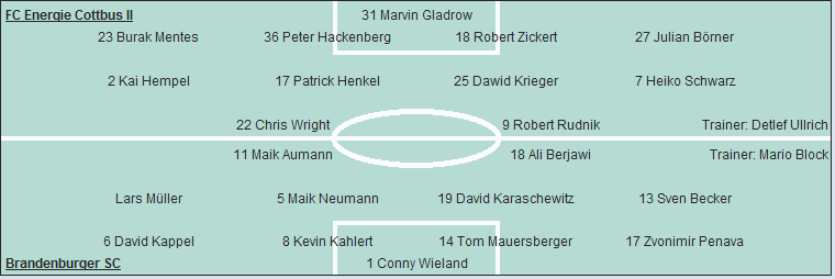 FC Energie Cottbus II: Marvin Gladrow - Burak Mentes, Peter Hackenberg, Robert Zickert, Julian Börner - Kai Hempel, Patrick Henkel, Dawid Krieger (85. Florian Schmidt), Heiko Schwarz (46. Fernando Lenk) - Chris Wright, Robert Rudnik (65. Andy Hebler)