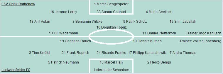 FSV Optik Rathenow: Martin Sengespeick - Jerome Leroy, Sasan Gouhari, Mario Seelisch - Anil Aslan, Benjamin Wilcke (66. Dejan Kalan), Patrik Scholz, Slim Jaballah (80. Jan Streisel) - Dogukan Topuz (66. André Zielke) - Till Wedemann, Daniel Pfefferkorn