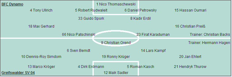 BFC Dynamo: Nico Thomaschewski - Tony Ullrich, Robert Rudwaleit, Daniel Petrowsky, Hassan Oumari - Guido Spork, Kadir Erdil - Max Gerhard, Christian Preiß - Nico Patschinski (88. Stephan Krause), Firat Karaduman (68. Danny Kukulies)