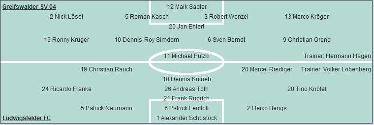 Greifswalder SV 04: Maik Sadler - Nick Lösel, Roman Kasch, Robert Wenzel, Marco Kröger - Jan Ehlert - Ronny Krüger, Dennis-Roy Simdorn (80. Rico Böttcher), Sven Berndt (46. Dirk Erdmann), Christian Orend - Michael Putzki