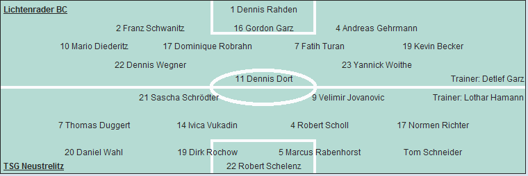 TSG Neustrelitz: Robert Schelenz - Tom Schneider, Marcus Rabenhorst, Dirk Rochow, Daniel Wahl - Normen Richter (73. Aleksander Simic), Robert Scholl, Ivica Vukadin, Thomas Duggert - Velimir Jovanovic (79. Ingo Wunderlich), Sascha Schrödter (79. Sebastian Hollenbach)