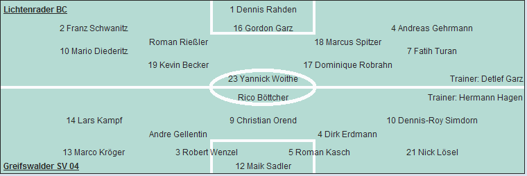 Greifswalder SV 04: Maik Sadler - Nick Lösel (61. Felix Ackermann), Roman Kasch, Robert Wenzel, Marco Kröger - Dirk Erdmann, Andre Gellentin - Dennis-Roy Simdorn (80. Sven Berndt), Christian Orend, Lars Kampf - Rico Böttcher