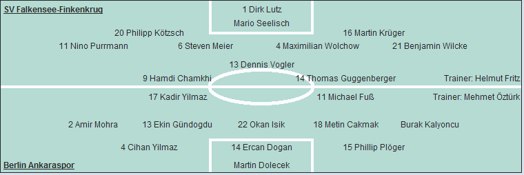 Berlin Ankaraspor: Martin Dolecek - Phillip Plöger, Ercan Dogan, Cihan Yilmaz - Burak Kalyoncu, Metin Cakmak (71. Burak Salantur), Okan Isik (74. Ömer Tetik), Ekin Gündogdu, Amir Mohra - Michael Fuß, Kadir Yilmaz (64. Fatih Erdem)