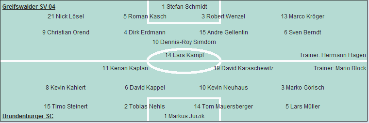 Greifswalder SV 04: Stefan Schmidt - Nick Lösel, Roman Kasch, Robert Wenzel, Marco Kröger - Christian Orend (80. Danny Martens), Dirk Erdmann, Andre Gellentin (46. Michael Putzki), Sven Berndt - Dennis-Roy Simdorn - Lars Kampf
