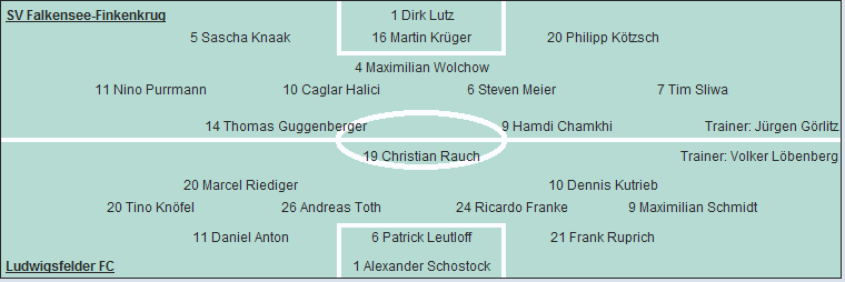 Ludwigsfelder FC: Alexander Schostock - Frank Ruprich, Patrick Leutloff, Daniel Anton - Maximilian Schmidt (53. Marcel Haß), Ricardo Franke (59. Heiko Bengs), Andreas Toth, Tino Knöfel (66. Markus Goede) - Dennis Kutrieb, Marcel Riediger - Christian Rauch