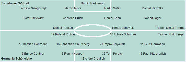 Torgelower SV Greif: Marcin Markiewicz - Tomasz Grzegorczyk, Marcin Mista, Martin Svitak, Daniel Nawotke (60. Karsten Eggert) - Piotr Dutkiewicz (83. Michael Schwerdtfeger), Andreas Brück, Daniel Köhn, Robert Jager - Daniel Pankau, Tomas Janoviak (73. James Georgeff)
