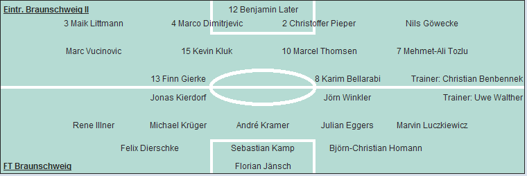 Eintracht Braunschweig II: Benjamin Later - Maik Littmann, Marco Dimitrjevic, Christoffer Pieper, Nils Göwecke - Marc Vucinovic (56. Firat Basi), Kevin Kluk, Marcel Thomsen, Mehmet-Ali Tozlu (73. Christoph Taute) - Finn Gierke (73. Mohammed Badiki), Karim Bellarabi