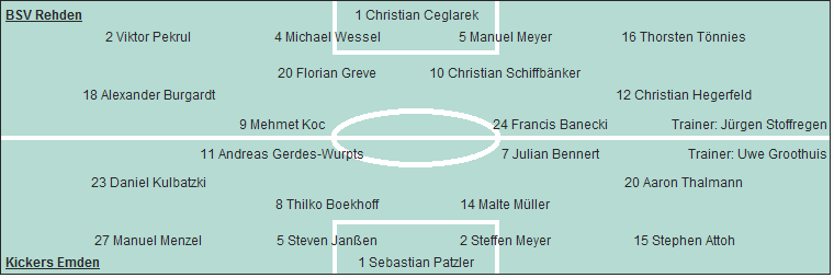 Kickers Emden: Sebastian Patzler - Stephen Attoh, Steffen Meyer (31. Navid Ali Torabian), Steven Janßen, Manuel Menzel - Malte Müller, Thilko Boekhoff - Aaron Thalmann, Daniel Kulbatzki - Julian Bennert (61. Adan Coronado), Andreas Gerdes-Wurpts