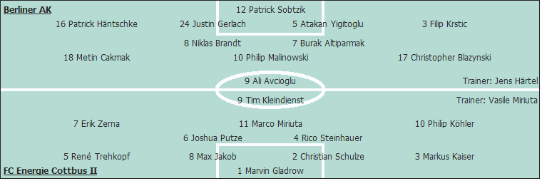 Berliner AK: Patrick Sobtzik - Patrick Häntschke, Justin Gerlach, Atakan Yigitoglu (46. Rocco Teichmann), Filip Krstic - Niklas Brandt (46. Christian Siemund), Burak Altiparmak - Metin Cakmak, Philip Malinowski (65. Nicolas Hebisch), Christopher Blazynski - Ali Avcioglu
