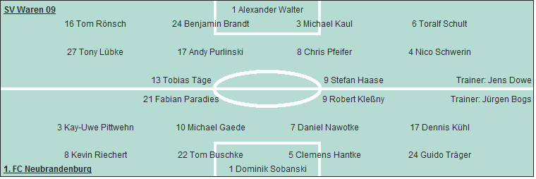 1. FC Neubrandenburg: Dominik Sobanski - Guido Träger, Clemens Hantke, Tom Buschke, Kevin Riechert - Dennis Kühl (80. Dominik Czech), Daniel Nawotke (74. Oliver Kowal), Michael Gaede, Kay-Uwe Pittwehn - Robert Kleßny, Fabian Paradies (57. Martin Lukaschik)