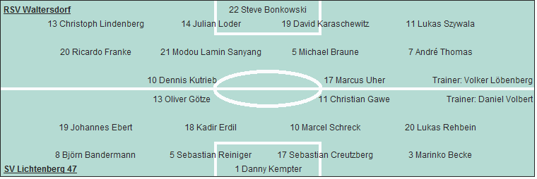 RSV Waltersdorf: Steve Bonkowski - Christoph Lindenberg, Julian Loder, David Karaschewitz, Lukas Szywala - Ricardo Franke, Modou Lamin Sanyang, Michael Braune, André Thomas (88. Philipp Karaschewitz) - Dennis Kutrieb (76. Ermin Sejdiji), Marcus Uher (62. Marc-Robert Borowski)