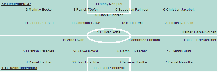 SV Lichtenberg 47: Danny Kempter - Marinko Becke, Patrick Töpfer, Sebastian Reiniger, Christian Jacobeit - Marcel Schreck - Johannes Ebert (59. Geoffrey Borchardt), Christian Gawe, Kadir Erdil, Lukas Rehbein (77. Christoph Zimdahl) - Oliver Götze (64. Moussa Doumbia)