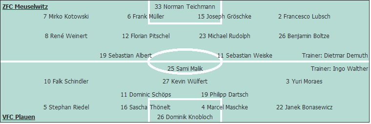 ZFC Meuselwitz: Norman Teichmann - Mirko Kotowski, Frank Müller, Joseph Gröschke (46. Robert Böhme), Francesco Lubsch - René Weinert, Florian Pitschel, Michael Rudolph (54. Raik Hildebrandt), Benjamin Boltze (85. Daniel Kornagel) - Sebastian Albert, Sebastian Weiske