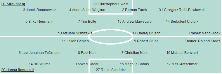 FC Strausberg: 21 Christopher Ewest - 3 Janek Bonasewicz, 4 Adam Anton Wiejkuc, 2 Roman Turek, 31 Grzegorz Rafal Pawlowski - 5 Sirko Neumann, 7 Tim Bolte, 16 Andrew Marveggio, 14 Serbulent Ulutürk (56. 27 Oliver Mertins) - 13 Atsushi Nishizawa (90. 6 Maximilian Hinz), 17 Ondrej Brusch (82. 11 Maximilian Ladewig)