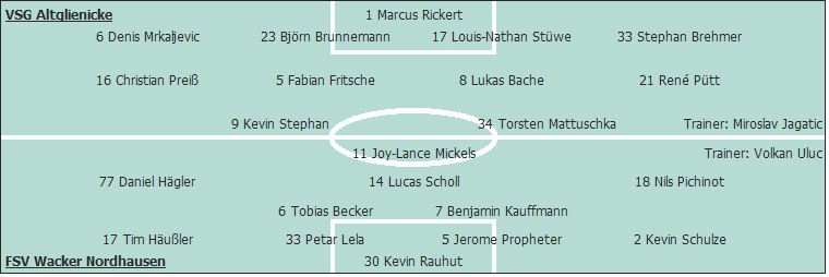 VSG Altglienicke: Marcus Rickert - Denis Mrkaljevic, Björn Brunnemann, Louis-Nathan Stüwe, Stephan Brehmer - Christian Preiß (78. Caner Özcin), Fabian Fritsche, Lukas Bache (83. Patrick Kroll), René Pütt - Kevin Stephan, Torsten Mattuschka