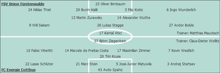 FSV Union Fürstenwalde: Oliver Birnbaum - Niklas Thiel, Burim Halili, Filip Krstic, Ingo Wunderlich - Martin Zurawsky, Alexander Wuthe - Will Siakam, Lukas Stagge (74. Kevin Dabo), Andor Bolyki - Kemal Atici