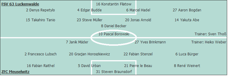 FSV 63 Luckenwalde: Konstantin Filatow - Denys Repetylo (55. Clemens Koplin), Edgar Budde, Marcel Hadel, Aaron Bogdan (67. Ramazan Günel) - Takahiro Tanio (75. Stefan Gehring), Steve Müller, Jonas Arnold, Yakuta Abe - Daniel Becker - Pascal Borowski