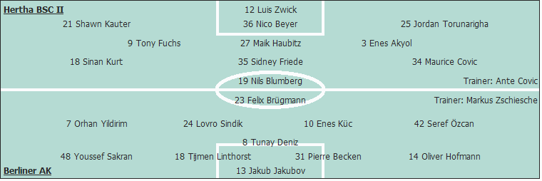 Hertha BSC II: Luis Zwick - Shawn Kauter, Nico Beyer (26. Florian Egerer), Jordan Torunarigha (46. Ugur Tezel) - Tony Fuchs, Maik Haubitz, Enes Akyol (54. Maximilian Pronichev) - Sinan Kurt, Sidney Friede, Maurice Covic - Nils Blumberg