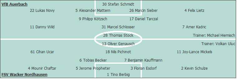 VfB Auerbach: Stefan Schmidt - Lukas Novy, Alexander Mattern, Marcin Sieber, Felix Lietz - Philipp Kötzsch (89. Kilian Müller), Daniel Tarczal (42. Vaclav Heger) - Danny Wild, Marcel Schlosser (46. Sebastian Schmidt), Amer Kadric - Thomas Stock