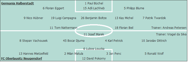 Germania Halberstadt: Paul Büchel - Florian Eggert, Adli Lachheb, Philipp Blume - Nico Hübner (86. Patrick Baudis), Luigi Campagna (81. Tim Oschmann), Benjamin Boltze, Kay Michel, Patrik Twardzik - Tom Nattermann (66. Dustin Messing), Florian Beil