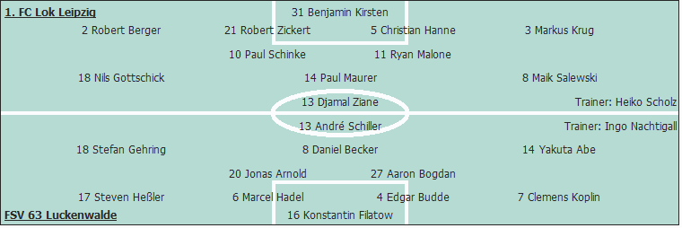 1. FC Lok Leipzig: Benjamin Kirsten - Robert Berger, Robert Zickert, Christian Hanne, Markus Krug (55. Marcel Trojandt) - Paul Schinke (77. Andy Wendschuch), Ryan Malone - Nils Gottschick (55. Matus Lorincak), Paul Maurer, Maik Salewski - Djamal Ziane