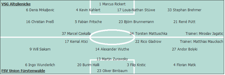 VSG Altglienicke: Marcus Rickert - Denis Mrkaljevic, Kevin Kahlert (62. Patrick Kroll), Louis-Nathan Stüwe, Stephan Brehmer - Christian Preiß, Fabian Fritsche, Björn Brunnemann, René Pütt (46. Caner Özcin) - Marcel Czekalla, Torsten Mattuschka